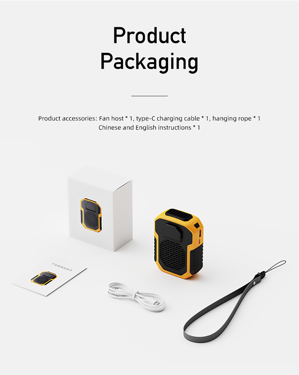 | Package Contents | 1 x Fan 1 x Charging Cable 1 x Lanyard 1 x User Manual |