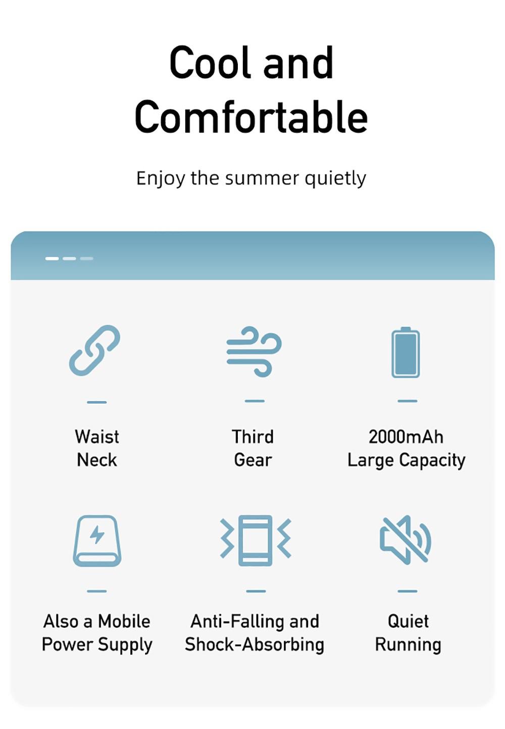 1. This mini portable fan can be hung on your neck or waist, or simply placed on a desktop.
