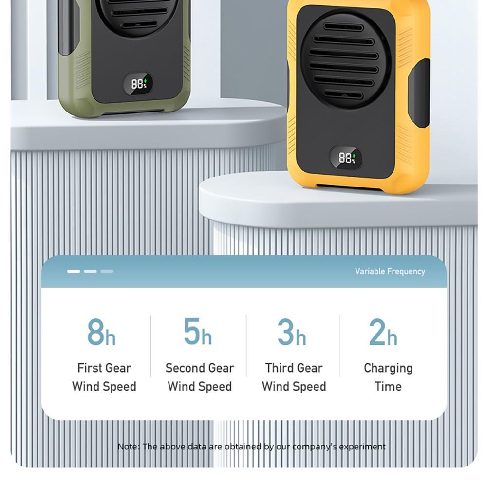 | Specification | Rated Input: DC 5.0V/1.0A Rated Power: ≤5W Battery Capacity: 2000mAh Battery Life: about 8 hours with 1st wind speed, 5 hours with 2nd wind speed, 3 hours with 3rd wind speed Charging Time: about 2 hours Product Material: ABS/silicone/electronic components |