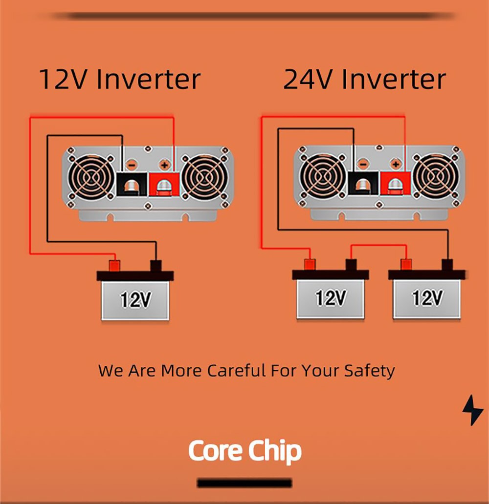 | General | Brand: FCHAO Type: Pure Sine Wave Inverter Model: 2500W 12V Color: Black + Orange |