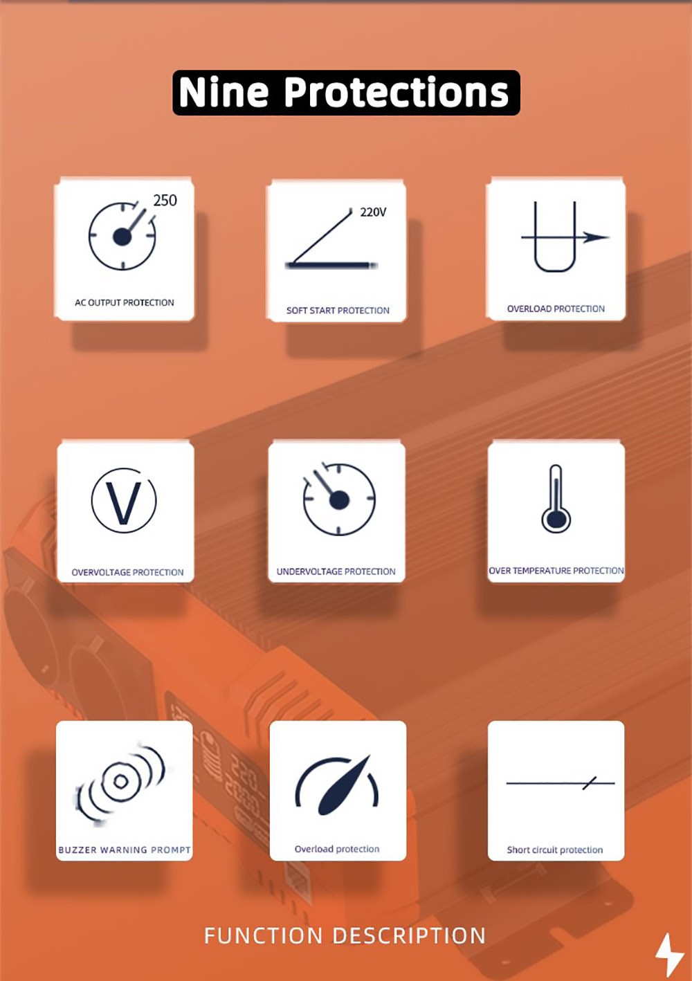 This 2500W pure sine wave inverter has an LCD display that shows battery ratio, battery (DC) voltage, alternating (AC) voltage, alternating power, and inner temperature. Furthermore, the cooling fan and protection indicators will be displayed when it is over the temperature and load limitation.
