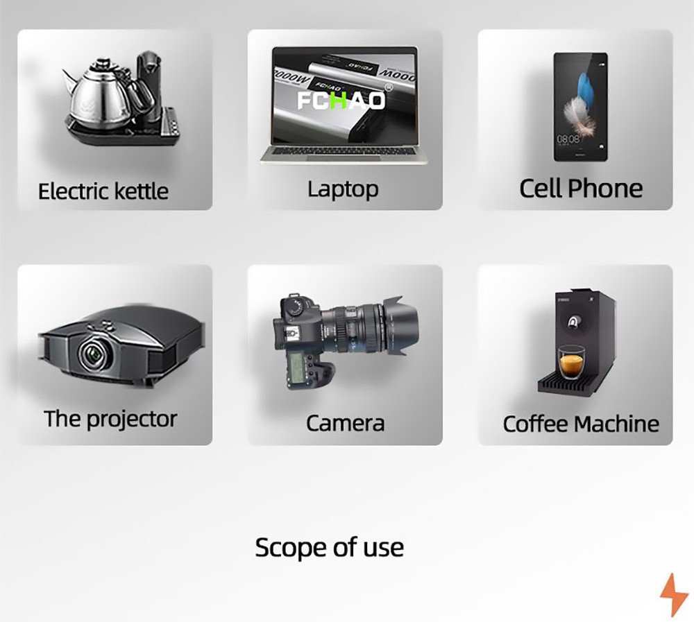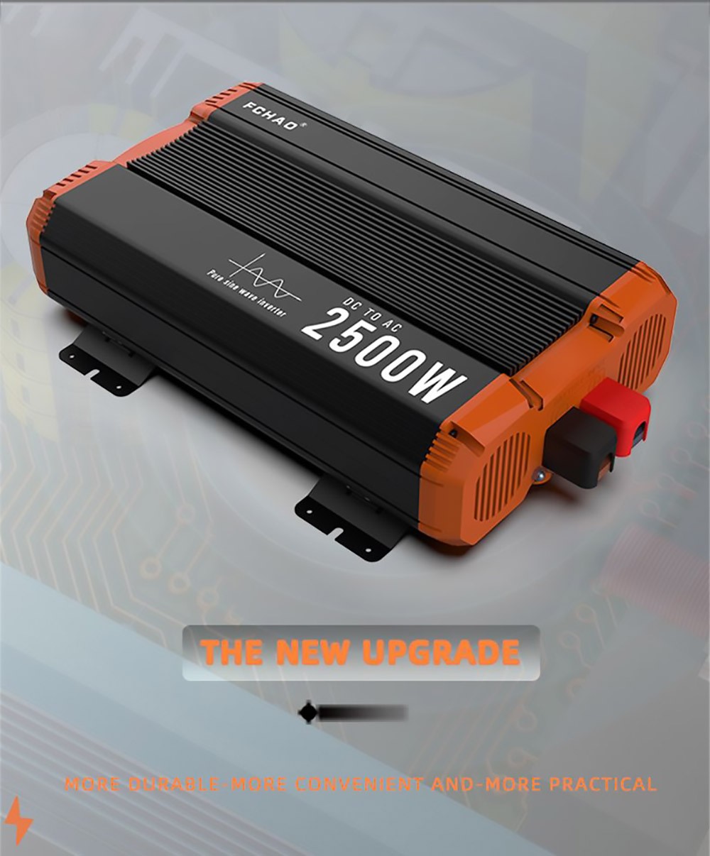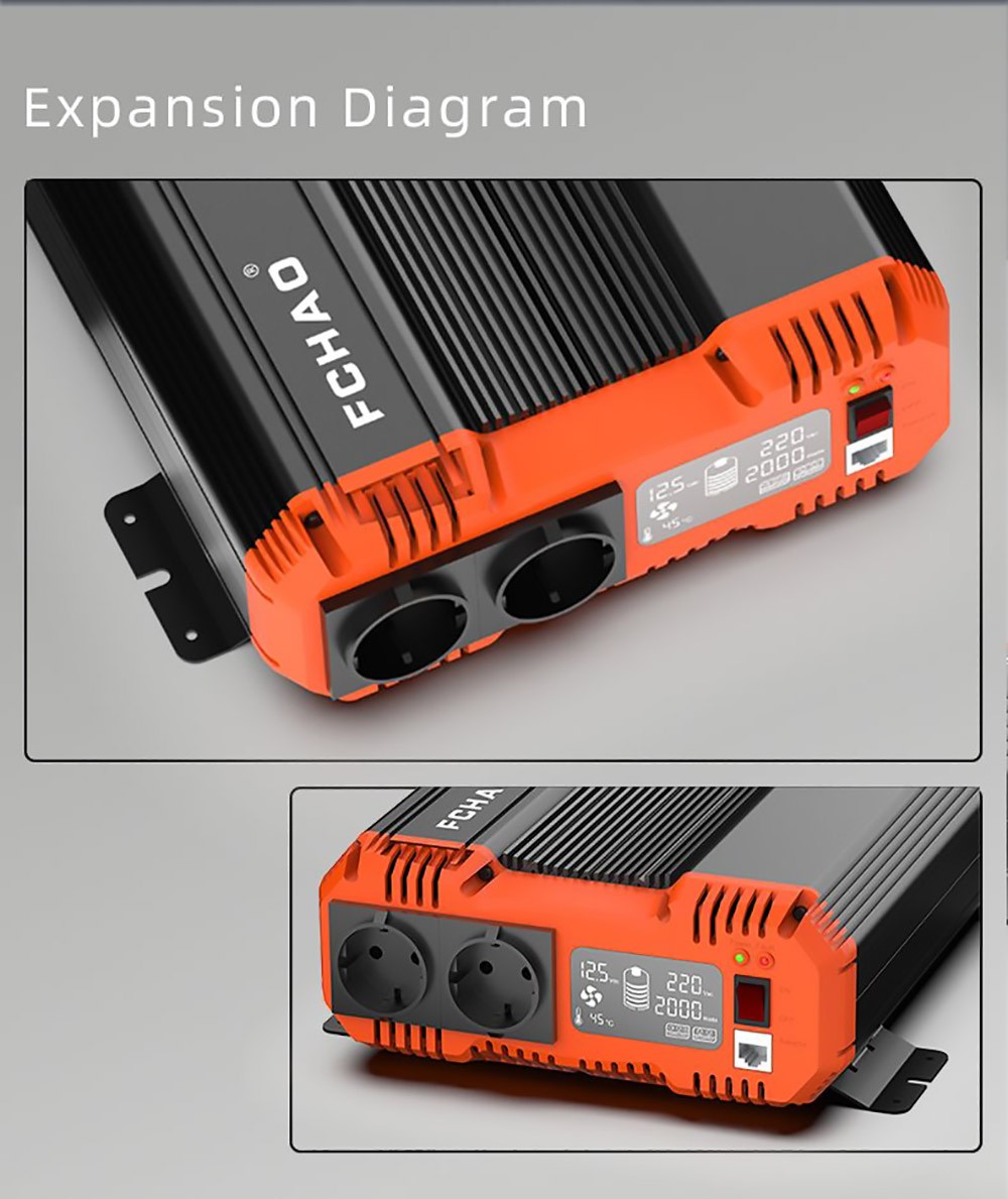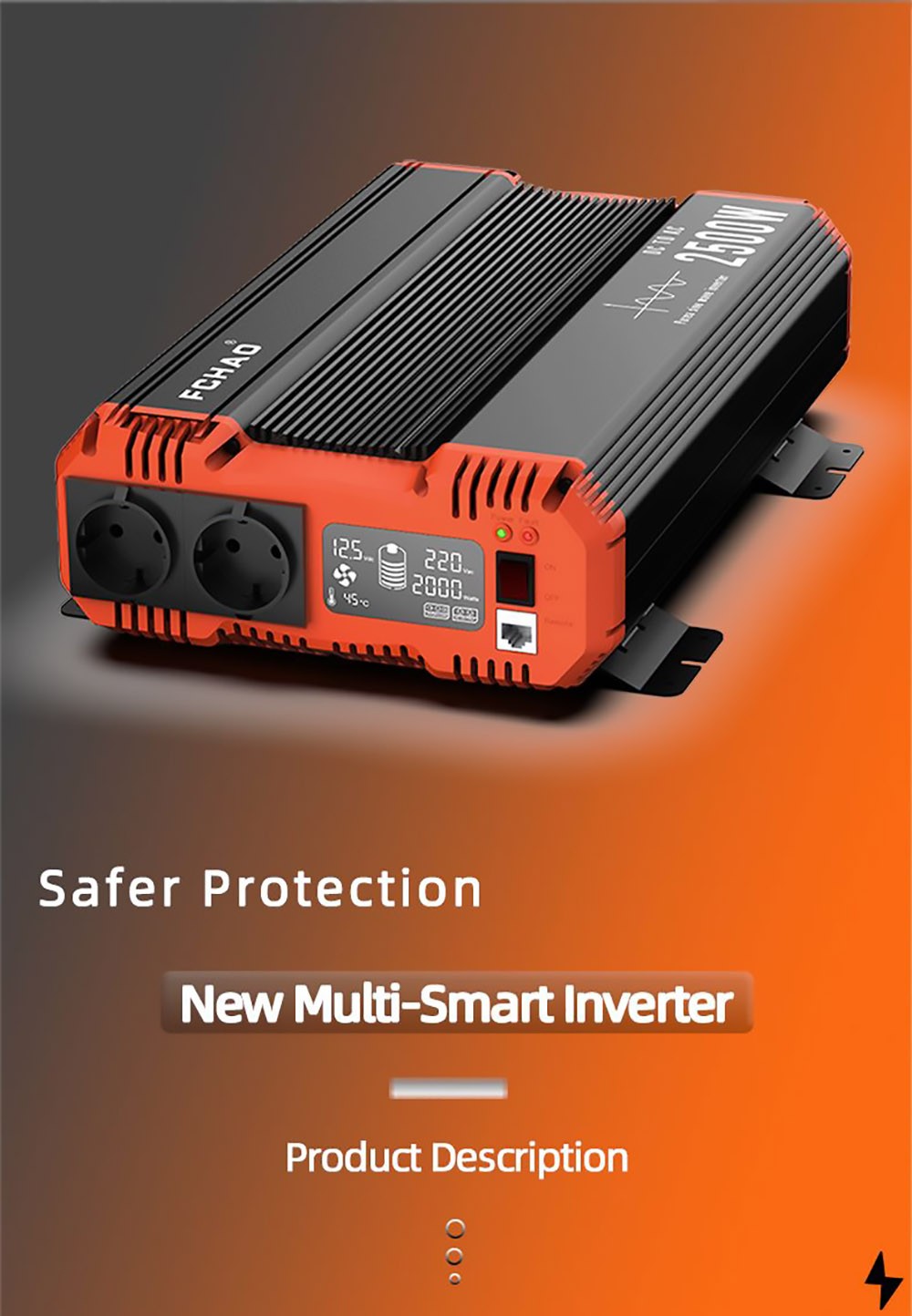 FCHAO 2500W inverter with continuous output power, surge power is 5000W during start-up. 12V DC to 230V±10% AC pure sine wave with a conversion efficiency of more than 90% and low conversion loss.