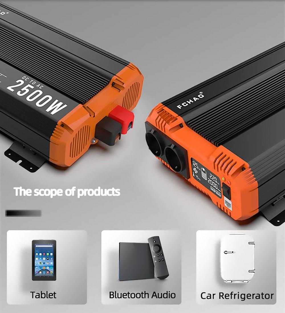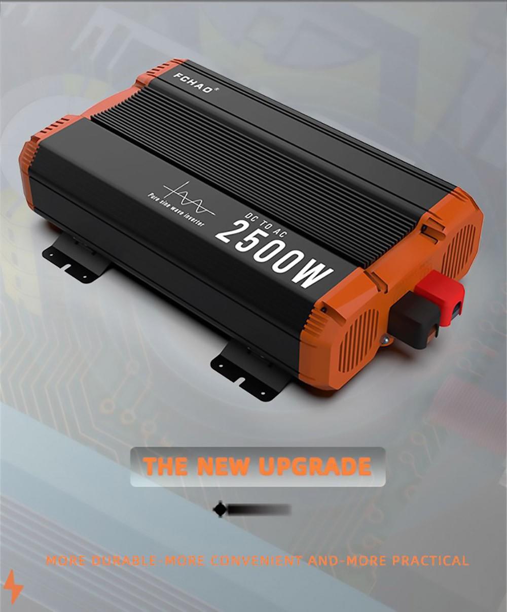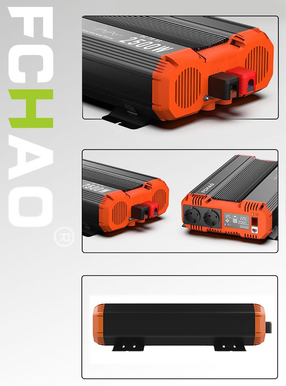 FCHAO 2500W inverter with continuous output power, surge power is 5000W during start-up. 24V DC to 230V±10% AC pure sine wave with a conversion efficiency of more than 90% and low conversion loss.