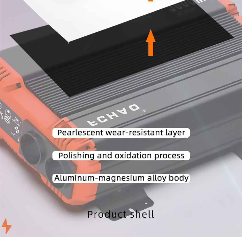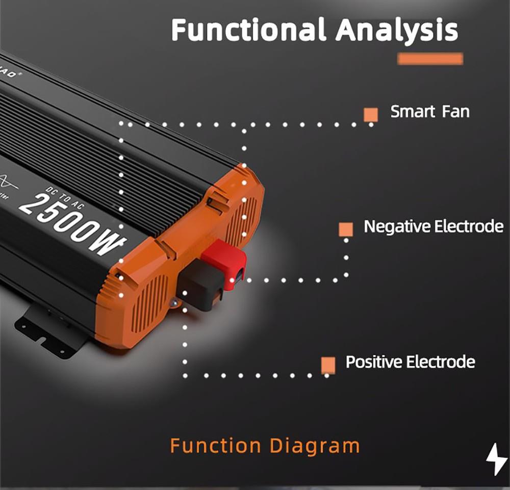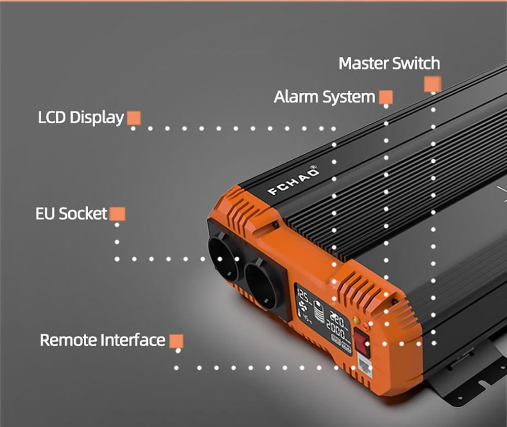 FCHAO 2500W inverter with continuous output power, surge power is 5000W during start-up. 24V DC to 230V±10% AC pure sine wave with a conversion efficiency of more than 90% and low conversion loss.