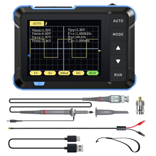 | Specification | Sampling rate: 2.5MSa/s Bandwidth: 200KHz Vertical sensitivity: 10mV/Div-20V/Div(Progress according to the 1-2-5 way) Time base range: 10μs/Div-50s/Div(Progress according to the 1-2-5 way) Voltage range: X1: ±40V (Vpp:80V); X10: ±400V (Vpp :800V) Trigger method: Auto/Normal/Single Coupling method: AC/DC Display: 2.8-inch / PPI: 320*240 USB charging: 5V/1A Lithium battery capacity: 1000mAh Square wave calibration: Frequency: 1K; Duty cycle: 50% |