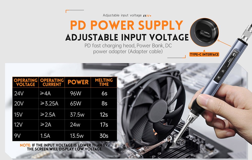 | Specification | Power: 65W Power Supply: USB Type-C port Screen: 0.87-inch OLED screen Temperature Range: 80-420 Celsius (180-780 Fahrenheit) Operating Voltage: DC 9-20V Fast Charging Protocol: PD Trigger |