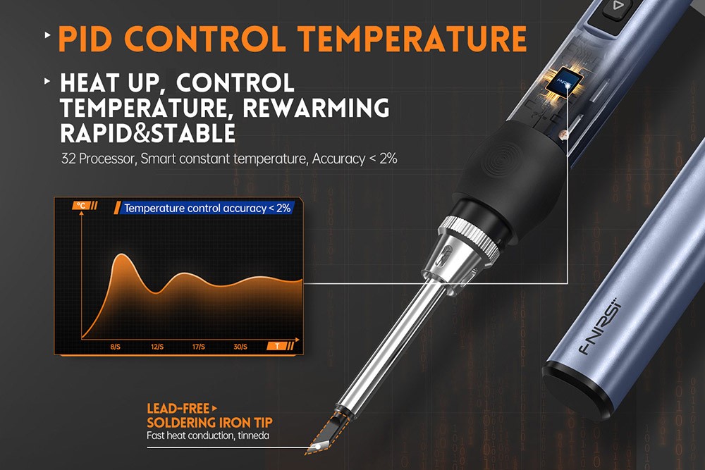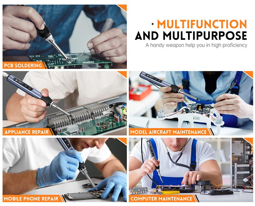This portable soldering iron heats up in seconds. The temperature is displayed on the OLED screen, which can be accurately and easily adjusted from 180 to 780 Fahrenheit (80 to 420 Celsius). It is suitable for drones, jewelry, watches, cell phones, and other precision and valuable objects welding repair.
