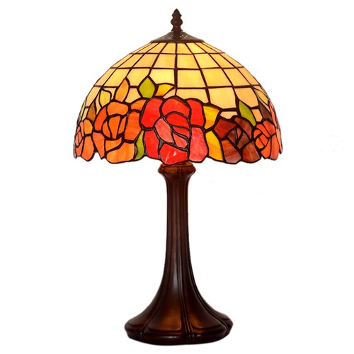 Multicolour stained glass cut outs were pieced together to create a lifelike rose lamp. These colourful pieces also create a warm translucent glow when the lamp is turned on.