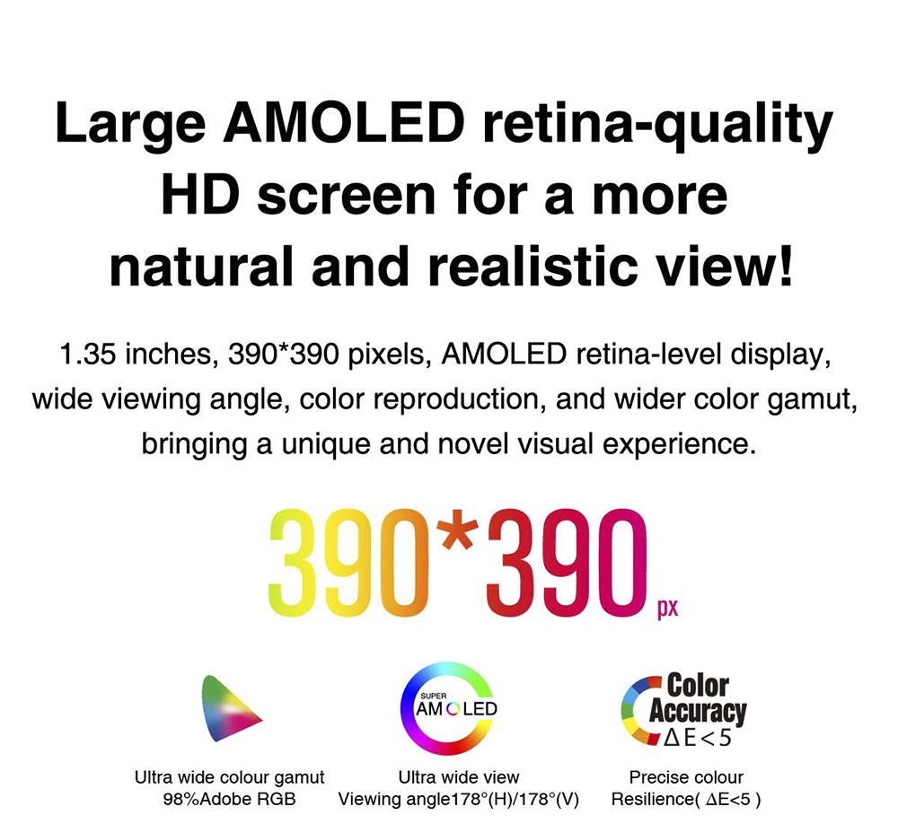 1. 1.35-inch ultra-thin frameless full-circle AMOLED high-definition display with 390*390px resolution.