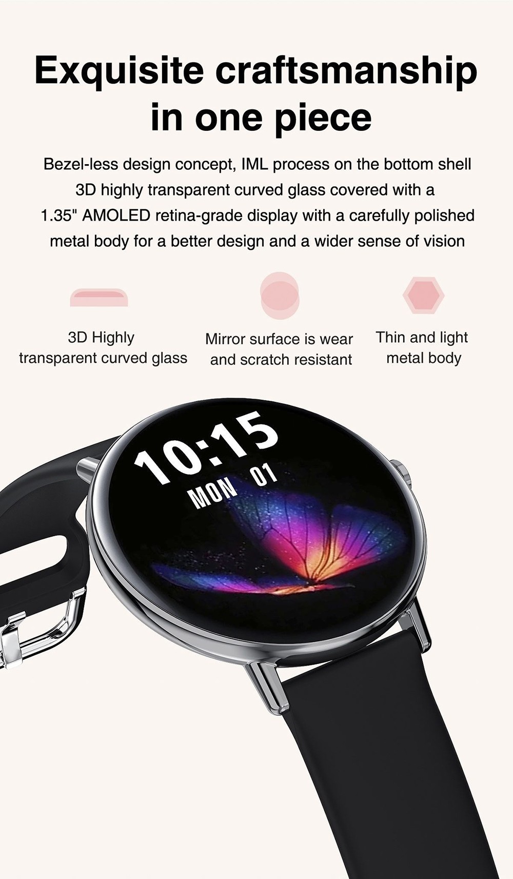 1. 1.35-inch ultra-thin frameless full-circle AMOLED high-definition display with 390*390px resolution.