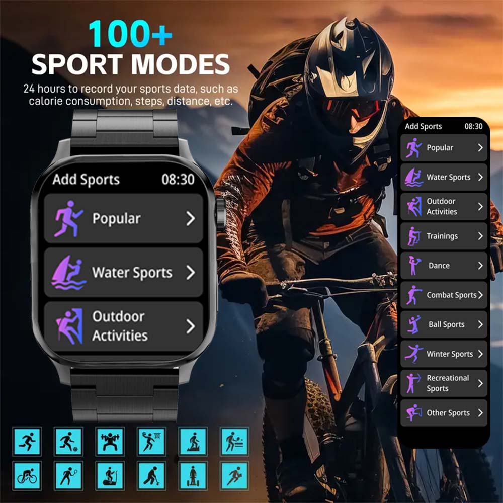 - 100+ sports modes, 24-hour recording of your sports data, such as calorie consumption, steps, distance, etc.