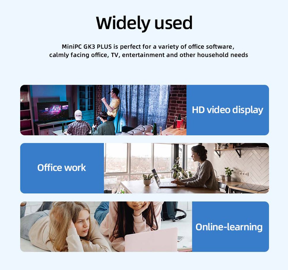 GK3 Plus mini pc comes with 8GB of DDR4 RAM, 256GB SATA SSD hard drive, you can expandable 2.5" hard drive (max 2TB) for M.2 2280 SATA SSD. This mini desktop computer with the express intention of for daily productivity & some creative content creation uses (word & spreadsheet processing, web conferencing, web browsing, light-duty picture editing, 4K online videos, creating light video contents etc.), powerful storage, nothing that would put a serious load on its system resources.