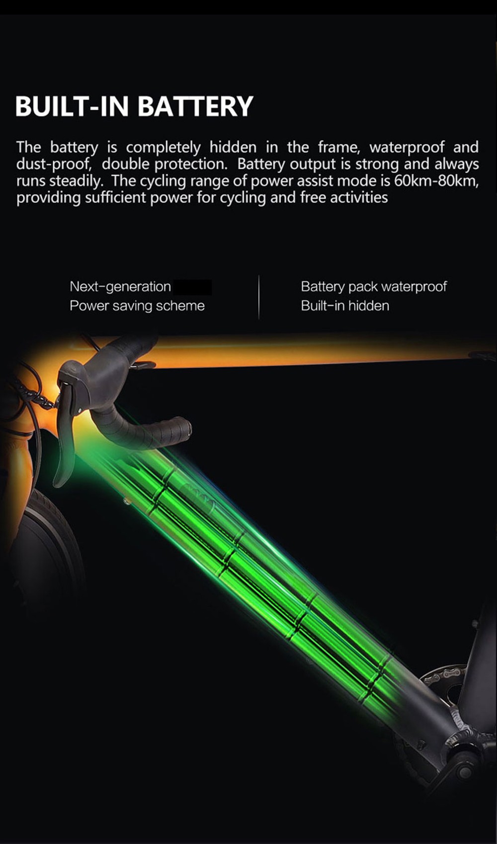 36V 9.6Ah Power supplies 18650 lithium battery pack, completely hidden inside the frame, waterproof and dustproof. The power-assisted mode can reach 80KM.