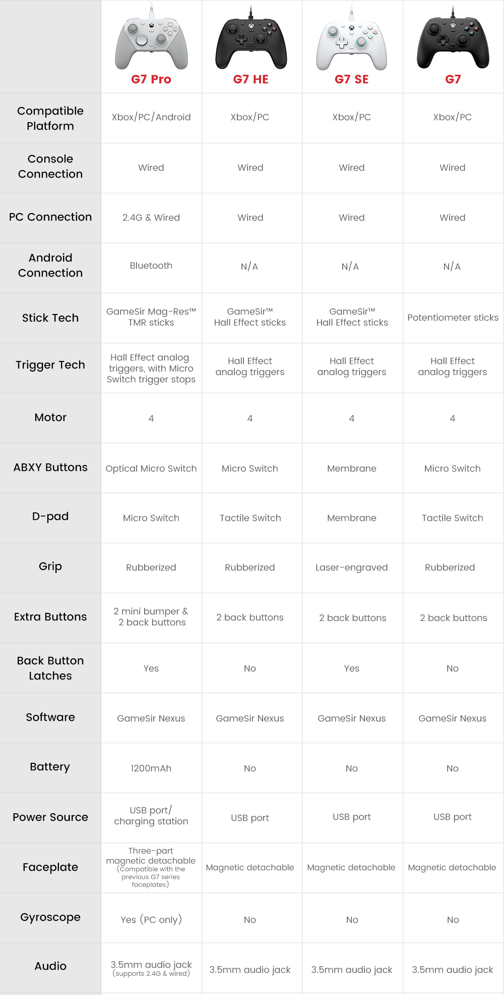 | Specification | Working Platform: Xbox Series X|S, Xbox One, PC, Android, Steam Connection: Wired for Xbox; 2.4G & Wired for PC; Bluetooth for Android Sticks: GameSir Mag-Res™ TMR sticks Triggers: Hall Effect analog triggers with Micro Switch trigger stops Buttons: Optical Micro Switch ABXY, Mechanical Micro Switch D-pad Rumble Motors: 4 Extra Buttons: 4 (R4/L4 back button and R5/L5 mini bumper) Back Button Latches: Yes 3.5mm Audio Jack: Yes, supported via both wired & 2.4G wireless Gyroscope: Yes (PC only) Battery: 1200mAh Charging Station: Included Software: GameSir Nexus Faceplate: Three-part magnetic swappable * Compatible with the previous G7 series faceplates, but other G7 series controllers are not compatible with the G7 Pro's faceplate. |