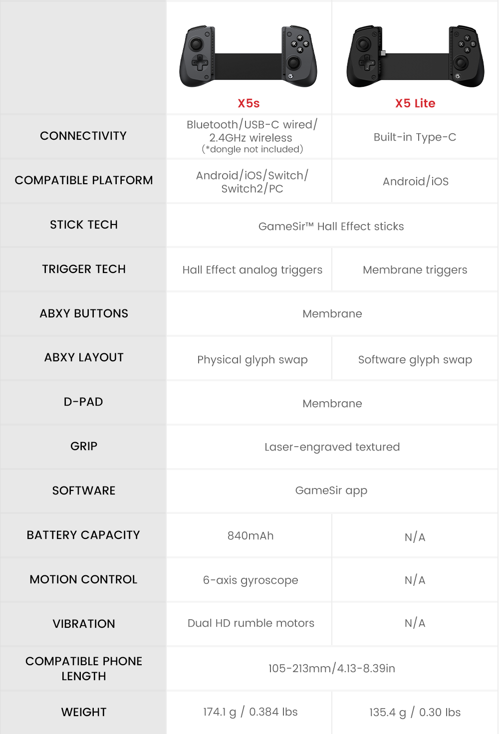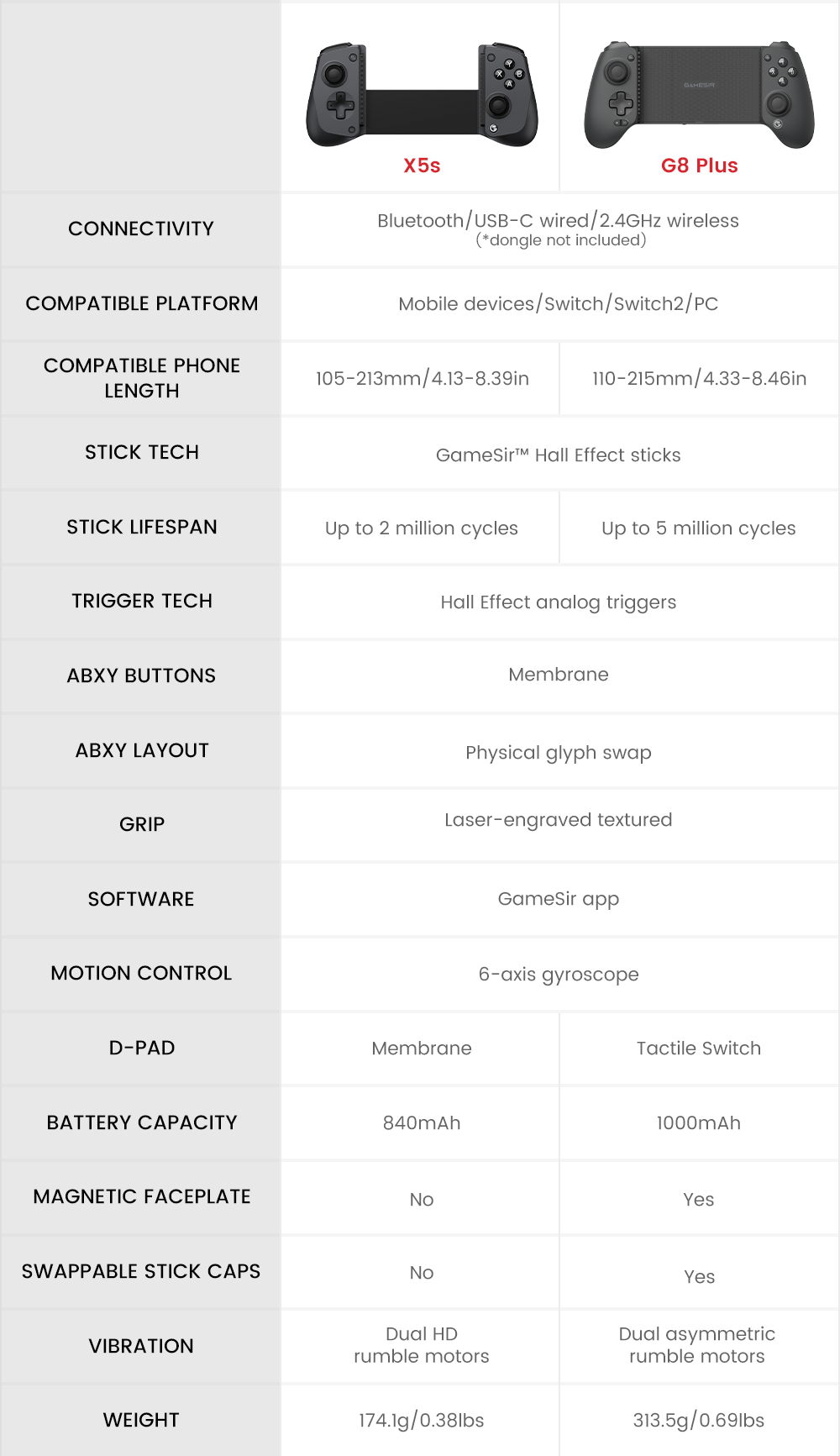 | Specification | Compatible Platforms: Switch, Switch2, Android, iOS, PC Compatible Device Length: 105-213mm / 4.13-8.39in Connectivity: Bluetooth, USB-C wired, 2.4GHz wireless (*2.4GHz dongle not included) Sticks: GameSir™ Hall Effect sticks Triggers: Hall Effect analog triggers Motion Control: Yes, 6-axis gyroscope Vibration: Dual HD rumble motors (in each grip) ABXY Buttons: Membrane ABXY Layout: Physically swappable D-pad: Membrane Turbo Function: Supported on A/B/X/Y/LB/RB/LT/RT Grips: Laser-engraved textured grips Software: GameSir App Battery: 840mAh total (420mAh per side) Power Source: Type-C port |
