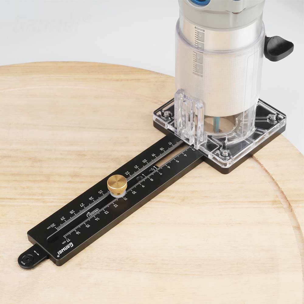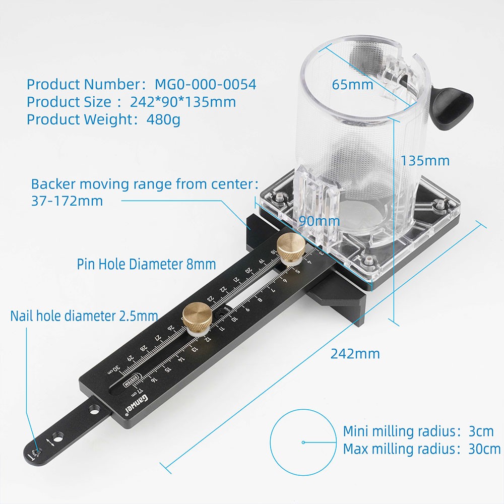 | Specification | Material: aluminum alloy + plastic transparent cover Adjustable scale range: 37-172mm (fast adjustment) Minimum milling radius: 30mm Maximum milling radius: 300mm Compatible router diameter: 65mm |