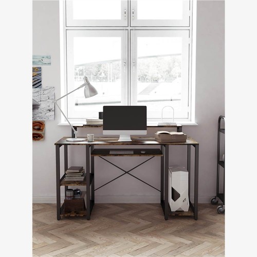 This computer desk features a silent sliding keyboard tray, lower shelves for the CPU, and two more open shelves for storage.