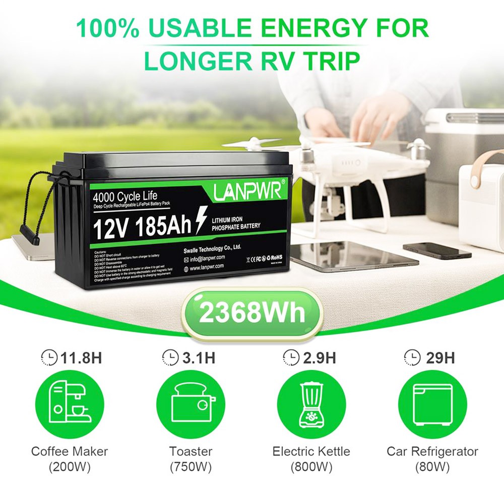 LANPWR 12V 185Ah lithium iron phosphate batteries have exceptional quality since they are manufactured by Automotive Grade LiFePO4 Cells with higher energy density, more stable performance & greater power. With no acid in the battery, you're able to safely mount it in any position. LiFePO4 batteries can be recycled and do not produce elements that are harmful to the environment, but lead-acid batteries pollute the environment.