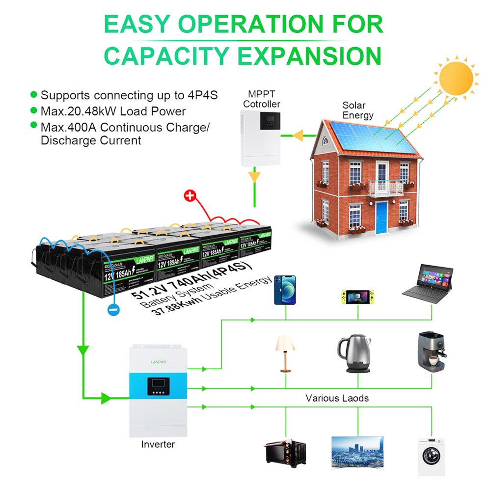 LANPWR LiFePO4 battery can be connected in parallel and in series for larger capacity and voltage. Max connection in series: Up to 4 identical batteries for up to 48V connecting in series. Connection in parallels: it can connect multiple batteries, suggesting no more than 4pcs in parallel. Allow to be extended up to 4 in series and 4 in parallel (Max 4S4P) to get more capacity (Max 740Ah) and higher voltage (24V, 36V, 48V). When the batteries are used in parallel or series, the battery voltage and capacity must be the same and purchased in near time (within 3 months).