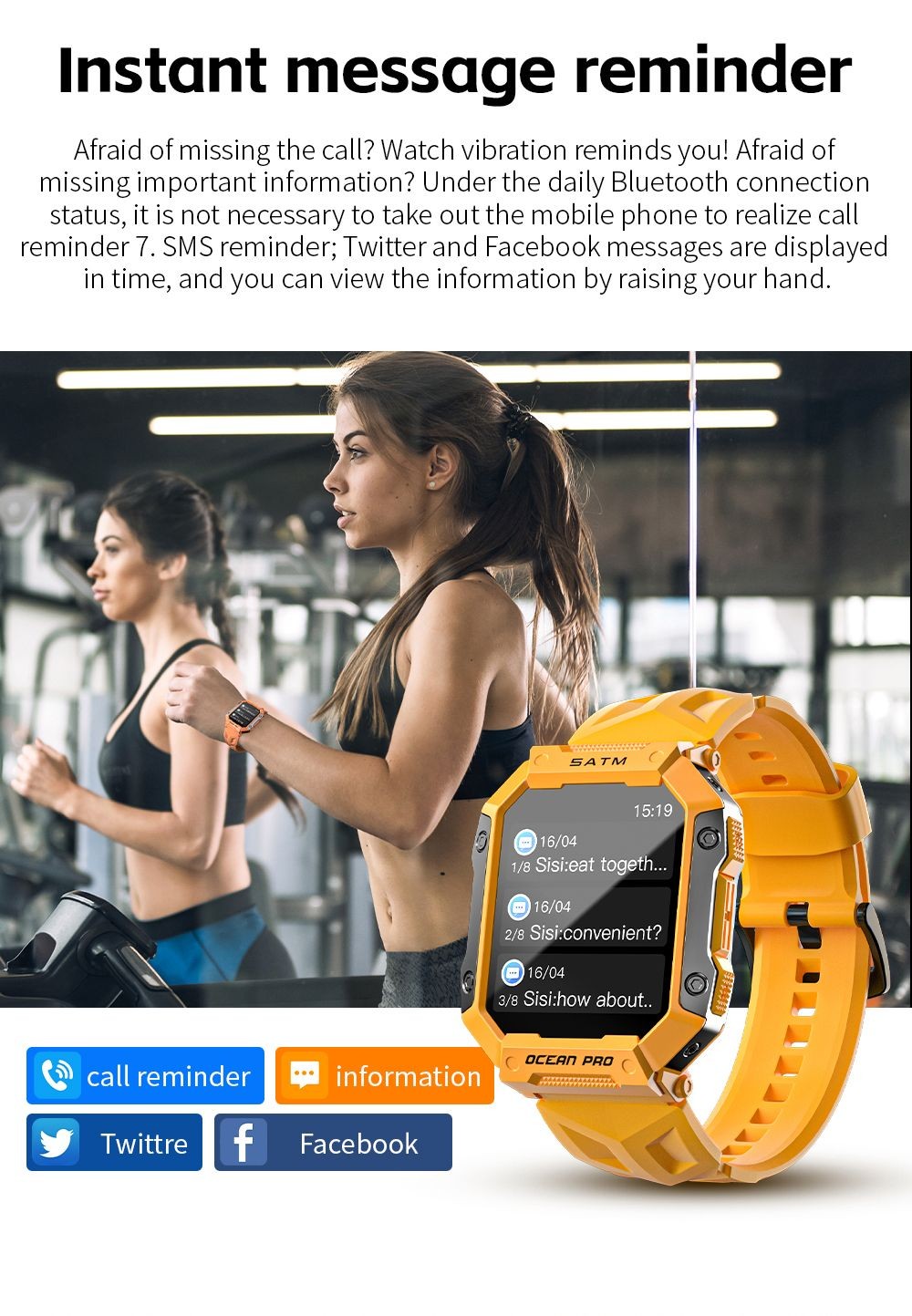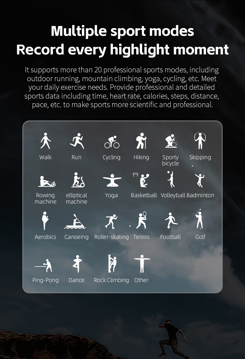 | Functions | Health tracker: Sleep detection, heart rate, blood pressure, breathing training Alert type: Vibration Other Functions: Custom watch face, step counting, brightness adjustment, multi-sport mode, information push, remote music, remote photo, real-time weather, find mobile phone (connected to mobile phone), alarm clock, stopwatch, do not disturb Mode, call reminder |