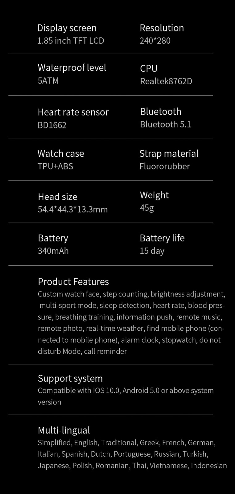 | Hardware | Built-in Chip: Realtek8762D Bluetooth Version: BT5.1 Memory: ROM 1MB FLASH + 256KB RAM external expansion 64Mb FLASH Water Resistant: IP68 System Requirement: Compatible with IOS 10.0, Android 5.0 and above Heart Rate Sensor: BD1662 |