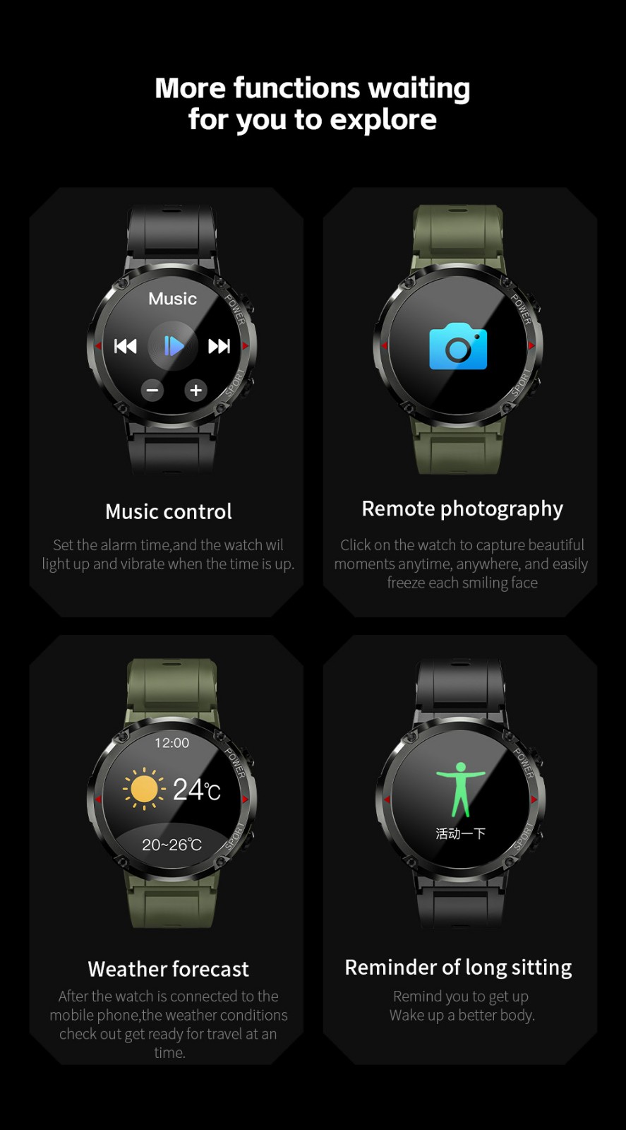| Functions | Health tracker: Sleep Detection, Heart Rate, Blood Pressure, Breathing Training Alert type: Vibration Other Function: Bluetooth calling, music playback, six-style theme menu, custom dial, step counting, brightness adjustment, multi-sport mode, information push, remote music, remote photography, real-time weather, mobile phone search (connected to a mobile phone), alarm clock, stopwatch, do not disturb mode, call reminder |