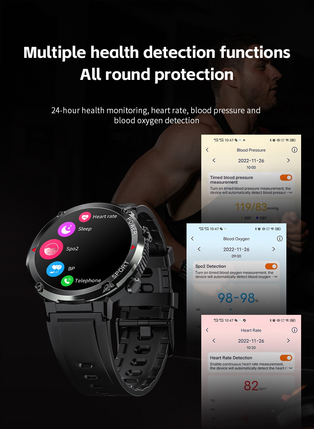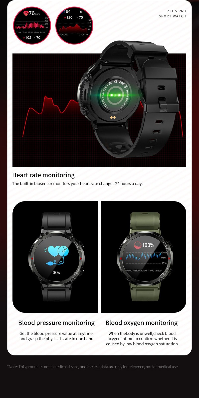 4. Heart rate monitoring, blood pressure monitoring, blood oxygen monitoring