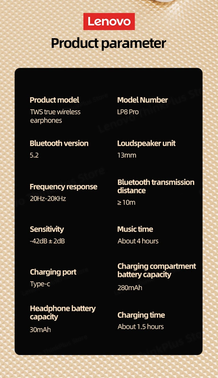 | General | Brand: Lenovo Type: Wireless Bluetooth Earphones Model: LP8 Pro Color: White |