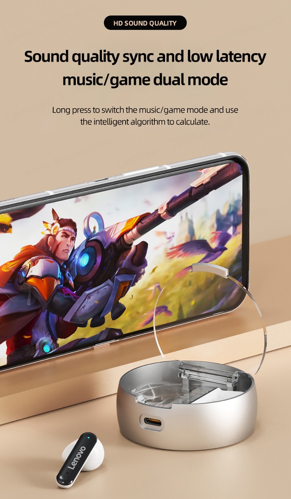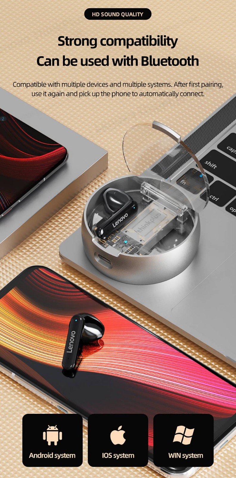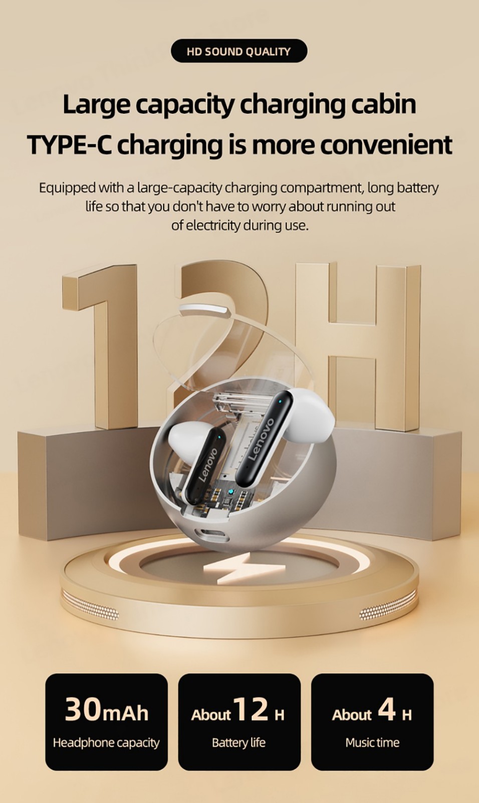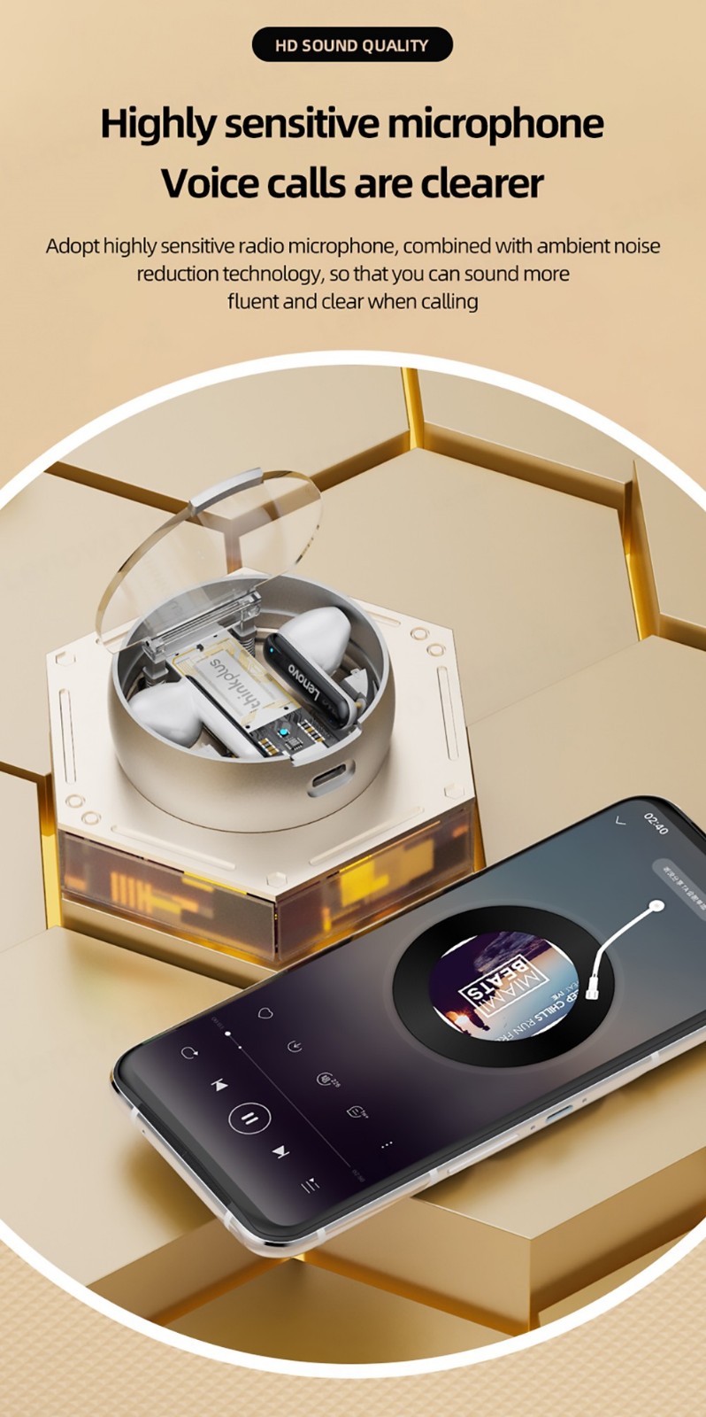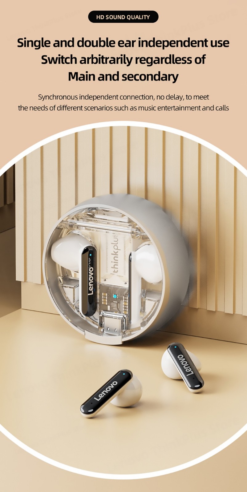1. Lenovo's latest design earphones in 2022. The charging compartment is made of aluminum alloy outer ring and a transparent PC cover for more visual texture