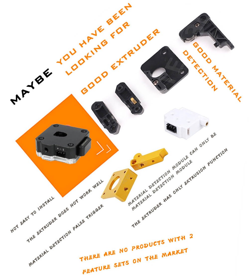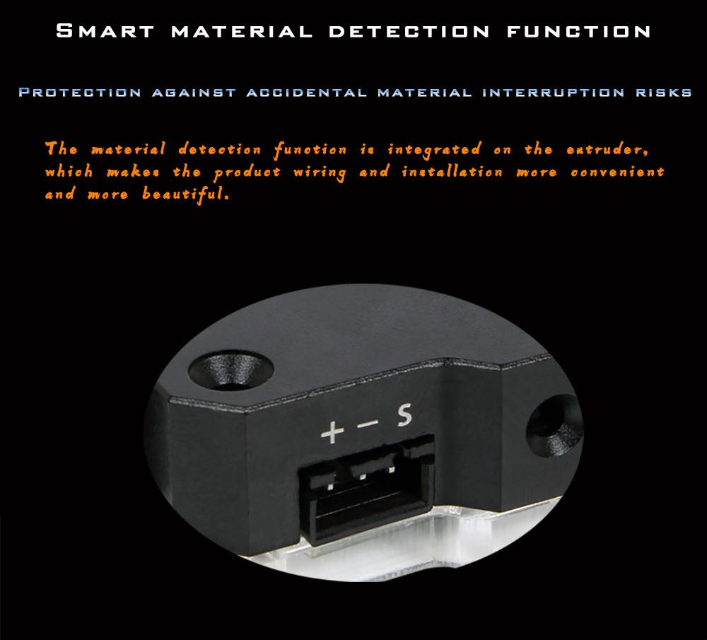2. The filament run-out detection function is integrated on the extruder, which makes the extruder wiring and installation more convenient and more beautiful. The MT extruder with filament sensor can reduce space occupation and provide better user experience.