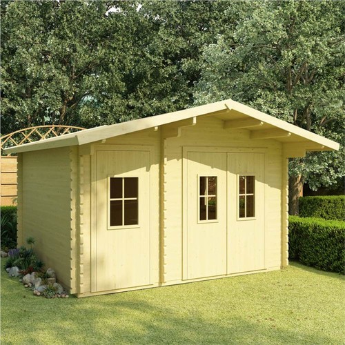 This durable wooden garden shed provides ample storage space for a wide variety of tools and equipment. It will make a great addition to any backyard, lawn, or garden area. Thanks to the solid pinewood material, this storage cabin is sturdy and weather resistant, ensuring long term outdoor use. The sloping roof allows rain and snow to easily fall off. The log cabin has 2 separate rooms with doors for easy access, and glass windows allow more natural light in. The garden shed is easy to assemble with mounting accessories included. Please note roofing felt is not included in the delivery.
