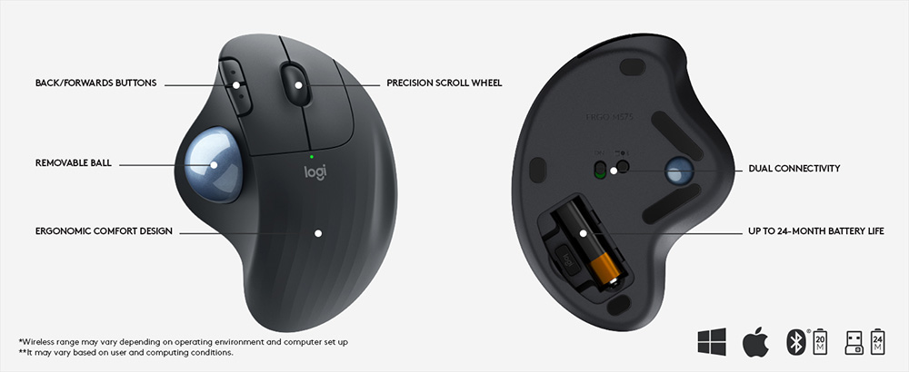 Up to 24-month of use from a single AA battery with the USB receiver, you might just forget your trackball uses batteries at all.