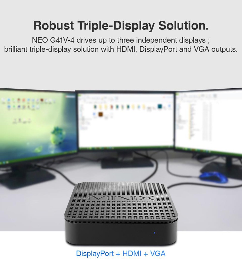 The brand new MINIX NEO G41V-4 is the ultimate fanless, triple-display Mini PC integrating high-end technologies into an ultra-small form factor. delivers responsive performance, high-speed connection options, and effortless multitasking.