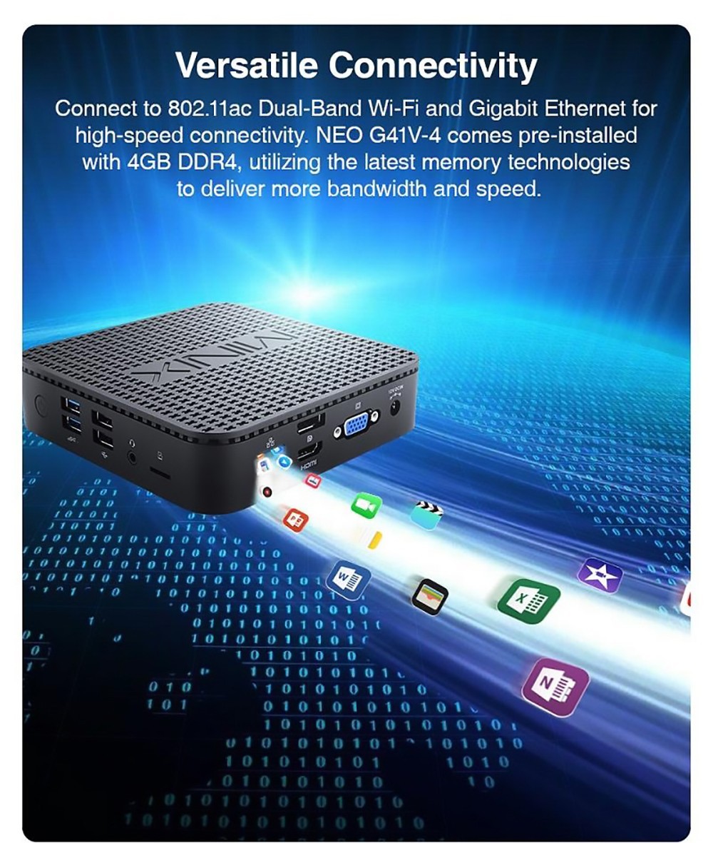 The brand new MINIX NEO G41V-4 is the ultimate fanless, triple-display Mini PC integrating high-end technologies into an ultra-small form factor. delivers responsive performance, high-speed connection options, and effortless multitasking.