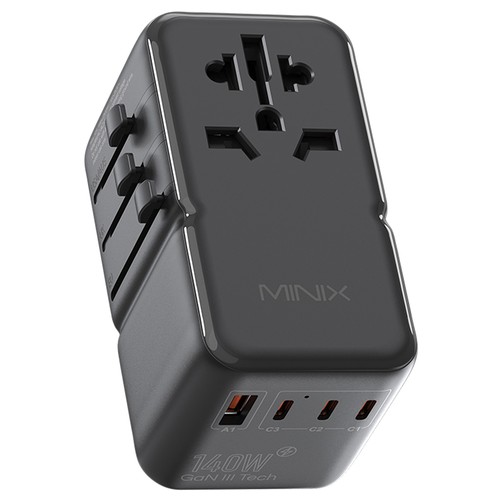 MINIX TP140 all-in-one travel adapter is a powerhouse with dual voltage (100-250V) support and a 2500W max output. MINIX's 140W 4-Port fast travel charger with built-in 3 USB-C (PD 3.1), 1 USB-A (QC 4+),1 AC Port. Perfect for laptops, digital cameras, iPad, iPod, smartphones, tablets, Bluetooth speakers, headphones and more.