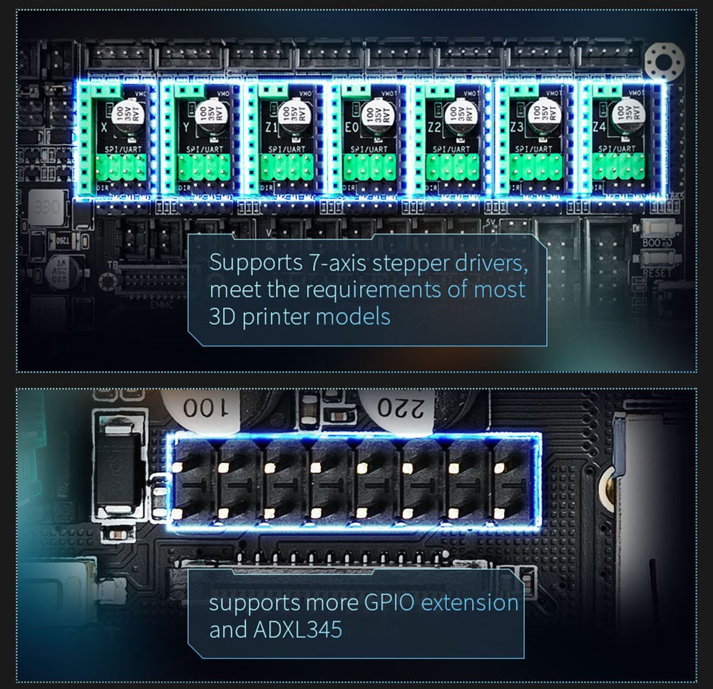 With 3-way controllable fans, plus 3-way normally open output, it can independently select VIN,12V, or 5V voltage. Designed with Schottky diode protection for MOS circuits and temperature measurement circuits. Designed with the back EMF energy absorption circuit to protect the stepper driver module. In addition, the Z+interface can independently set the voltage selection to adapt to different models of PROBE.
