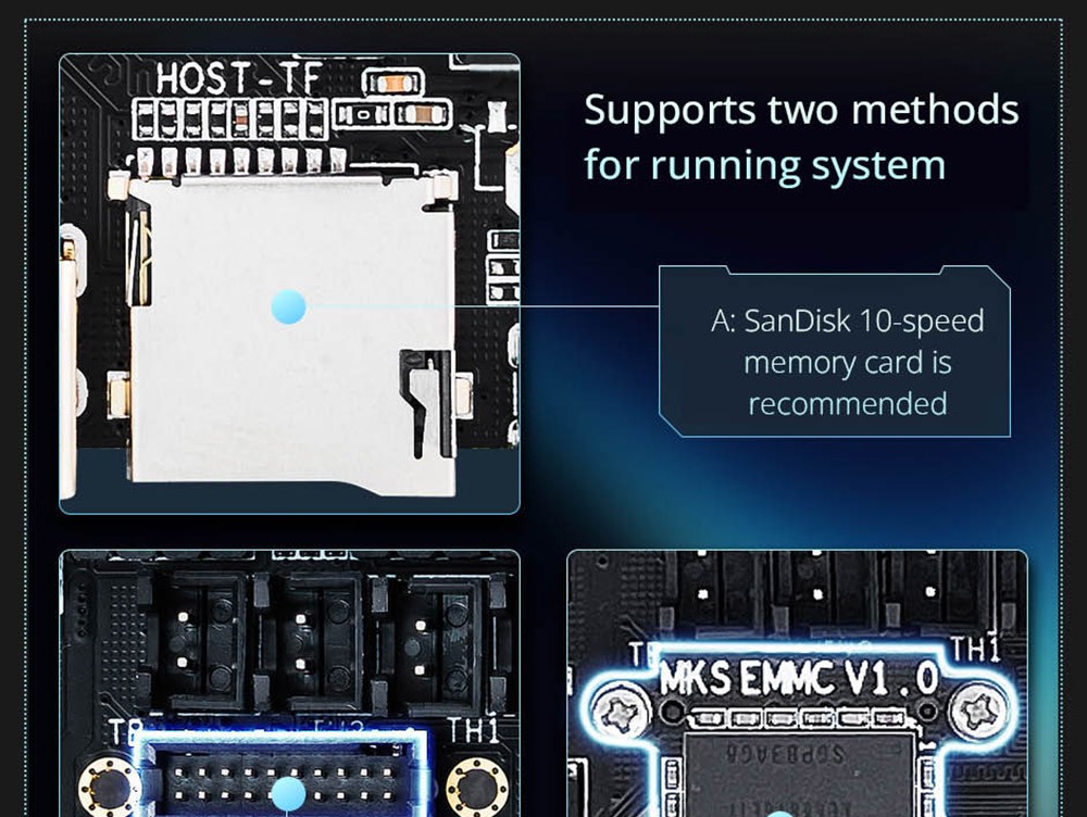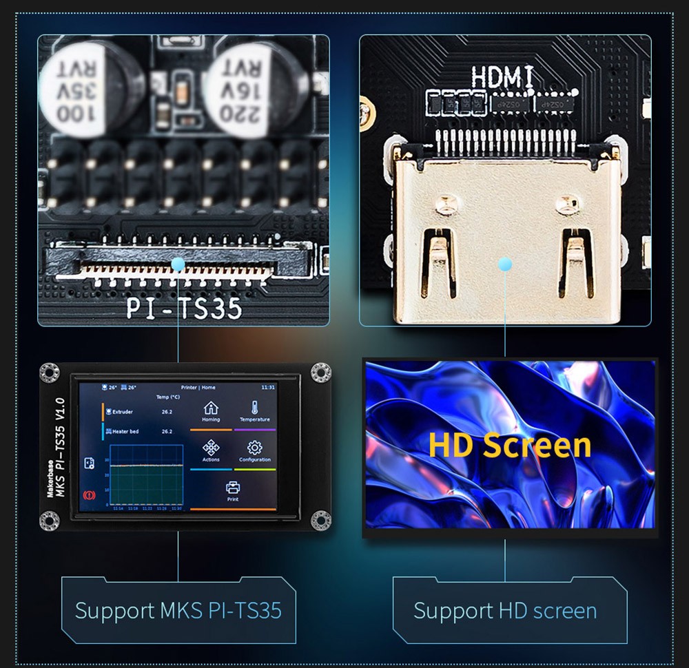 Retain the rich interface resources of MKS PI: with 1GBytes of DDR3 memory, support HDMI screen interface, PI-TS35 screen interface, provide wired Ethernet port, and 3-way USB interface (can be externally connected to the main control board, USB wireless network card, USB camera, U disk, USB keyboard and mouse, etc.).