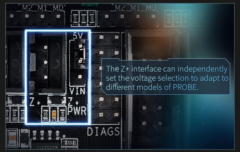 With 3-way controllable fans, plus 3-way normally open output, it can independently select VIN,12V, or 5V voltage. Designed with Schottky diode protection for MOS circuits and temperature measurement circuits. Designed with the back EMF energy absorption circuit to protect the stepper driver module. In addition, the Z+interface can independently set the voltage selection to adapt to different models of PROBE.