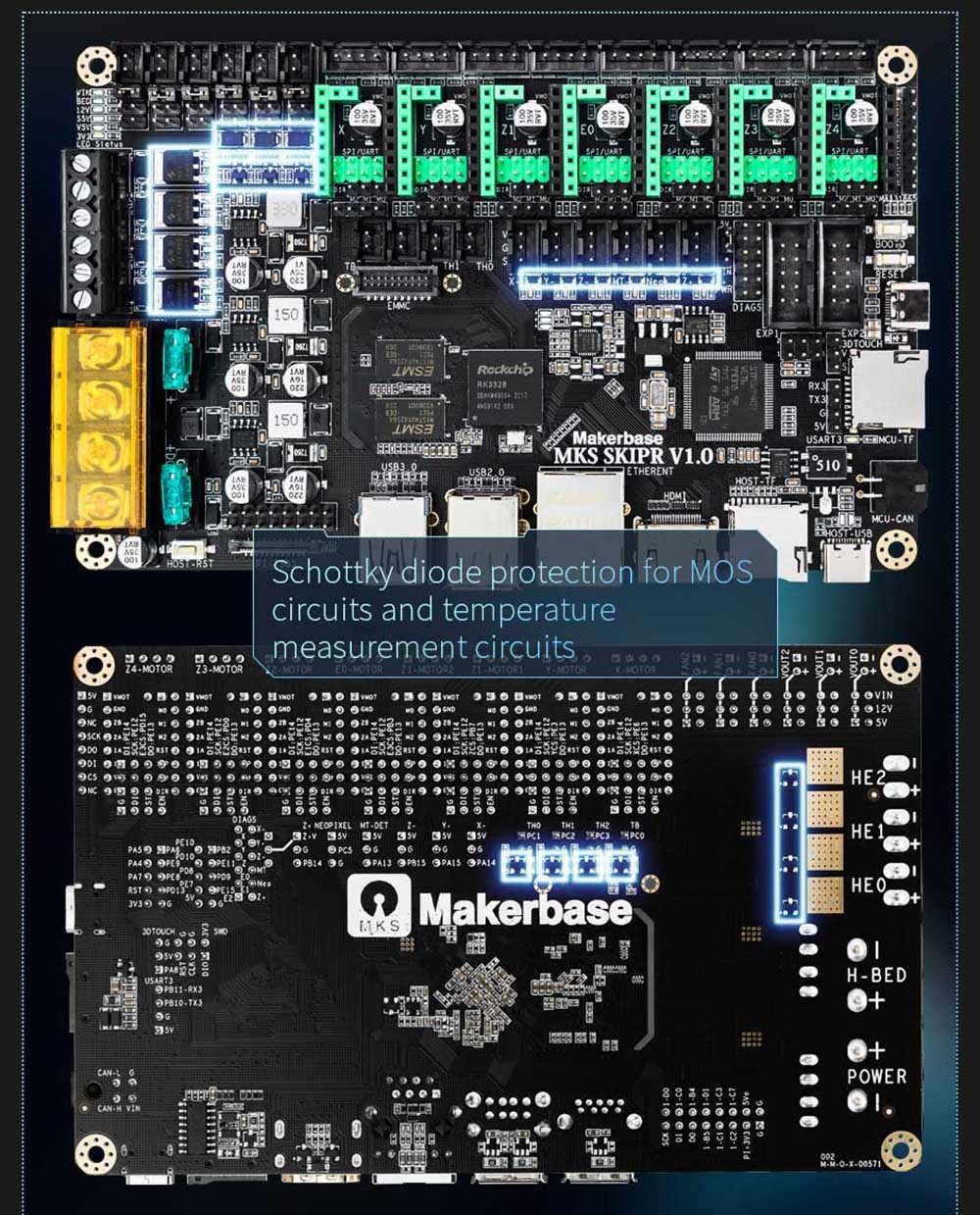 MKS SKIPR is an all-in-one board launched by Makerbase for running Klipper. It integrates the SOC running the Klipper host and the MCU responsible for executing specific machine actions. It meets the use of most 3D printers.