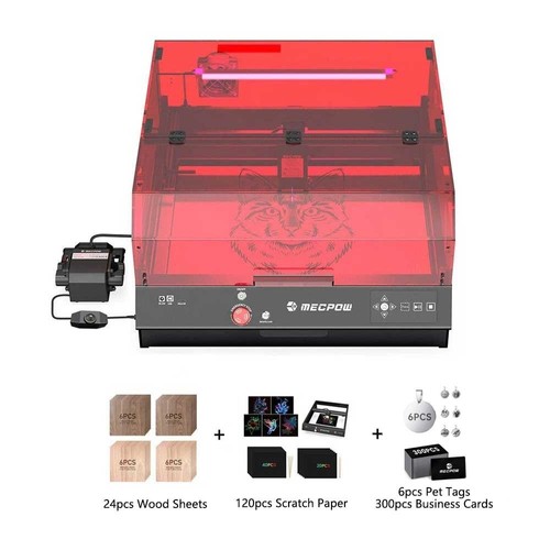 | Package Contents | 2 x Key 1 x Throat Hoop 1 x Screwdriver 1 x Exhaust Fan 1 x Exhaust Pipe 1 x Laser Module 1 x Power Adapter 2 x USB Cable 2 x Wood Board 1 x Metal Plate 1 x Goggles 1 x User Manual 1 x Air Pump 1 x Screw Pack 1 x Cleaning Brush 1 x WiFi Antenna 1 x Left Protective Cover 1 x Right Protective Cover 1 x Rear Protective Cover 1 x Front Protective Cover 5 x Adhesive Cable Clip 1 x Calibration Card 4 x Raiser 4 x Protective Cover Support 1 x TF Card 1 x TF Card Reader 1 x Wrench 24 x Mecpow Sheets 120 x Mecpow Scratch Paper Art Set 300 x Business Cards 6 x 25mm Pet Tags |