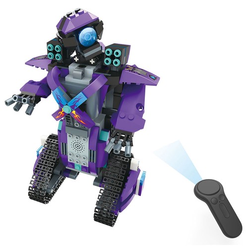 This 2.4G building block assembly remote control robot is equipped with remote control handle and four channels, controlling moving forward and back, left turn and right turn on the spot.