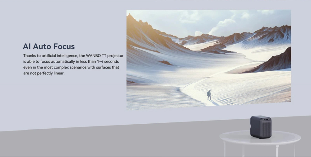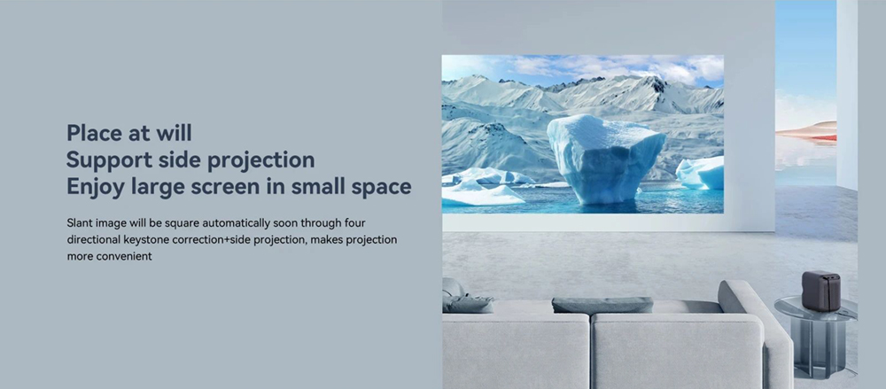 Wanbo TT Compact Projector can slant image that will be squared automatically via four directional keystone corrections as well as + side projection, which makes projection more convenient.
