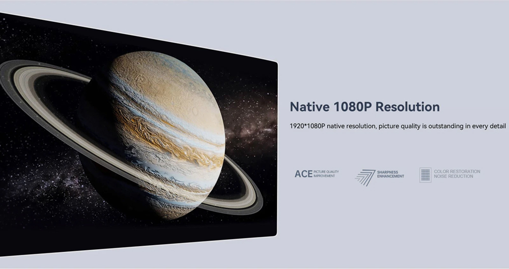 1920*1080 physical resolution, and perfectly enhances the picture contrast, outstanding in every detail including color with an original paint-perfect experience. This resolution delivers a full 2.07 million pixels picture with a display aspect ratio of 16:9.