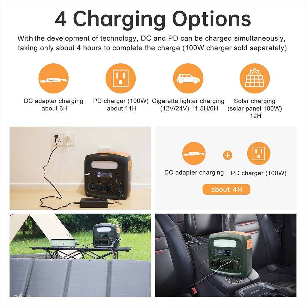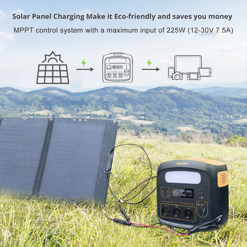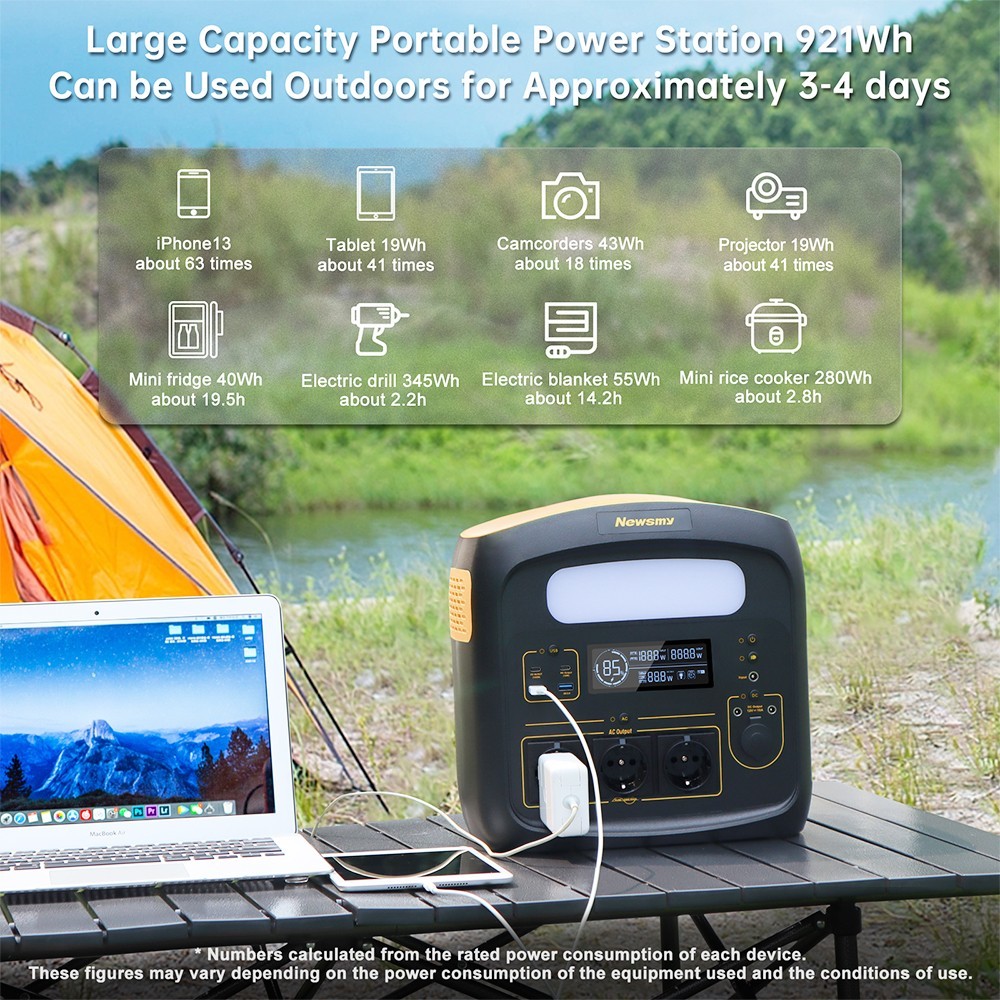 With a built-in battery with a high capacity of 921Wh/288000mAh, Newsmy N1200 is perfect for outdoor activities. It can be charged simultaneously via the Type-C input/output interface and the DC input interface, the estimated charging time via the single input interface is 6-8 hours, and via the two input interfaces 4-5 hours. It can also be charged with solar panels (not included).