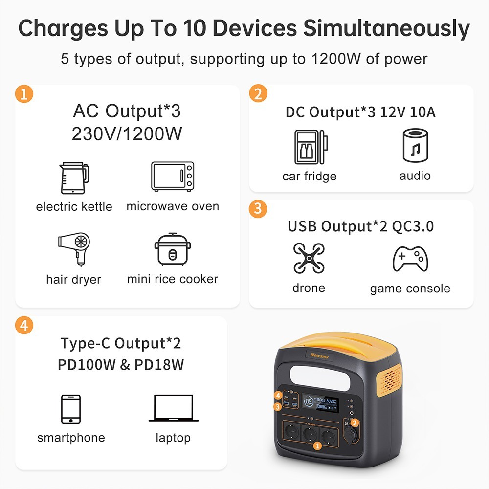 | General | Brand: Newsmy Type: Power Station Model: N1200 Color: Black + Orange |