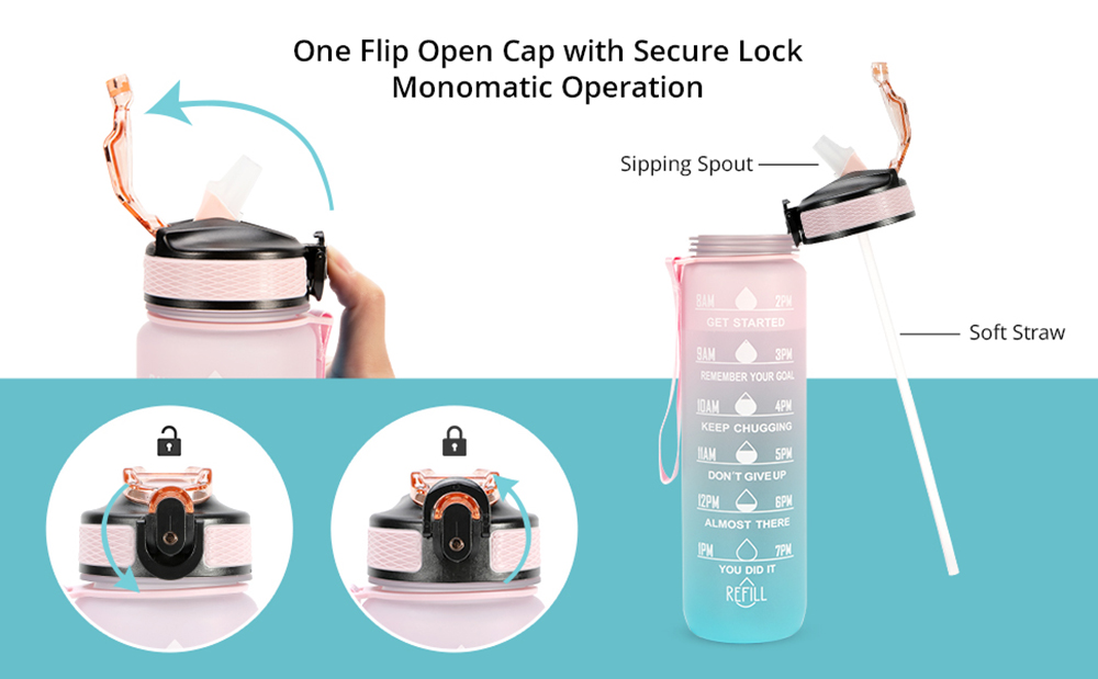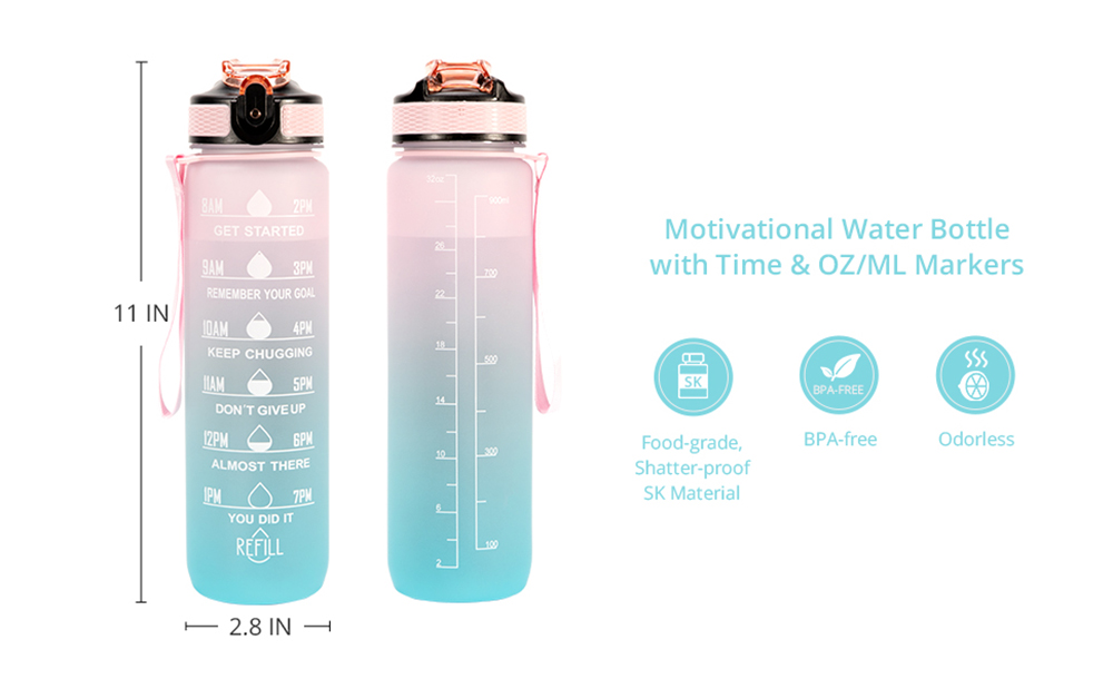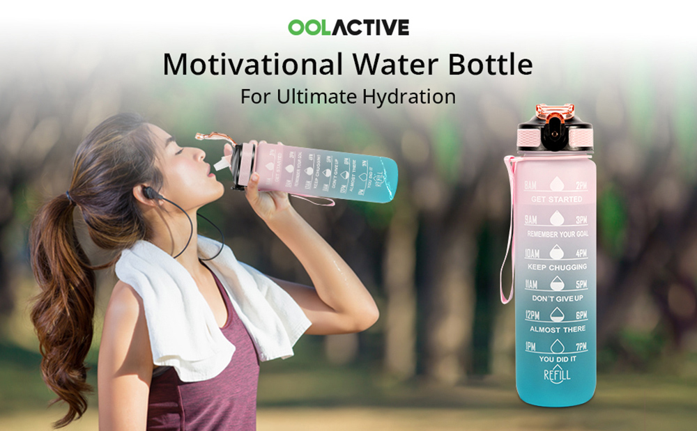 The motivational water bottle has a large 34oz liquid capacity so you don’t need to replenish it frequently on the way. Keep you hydrated and quickly revive you after outdoors activities.