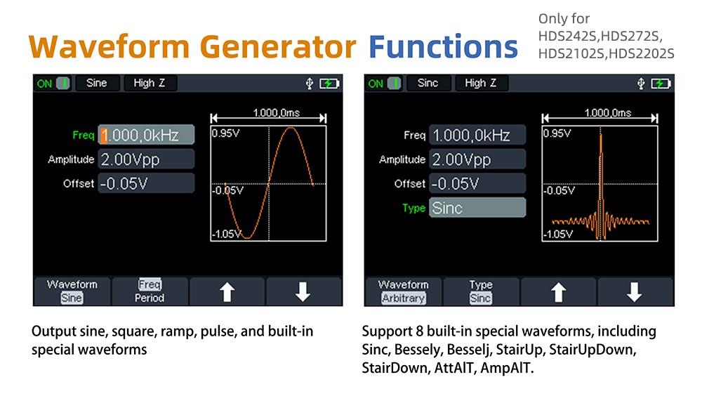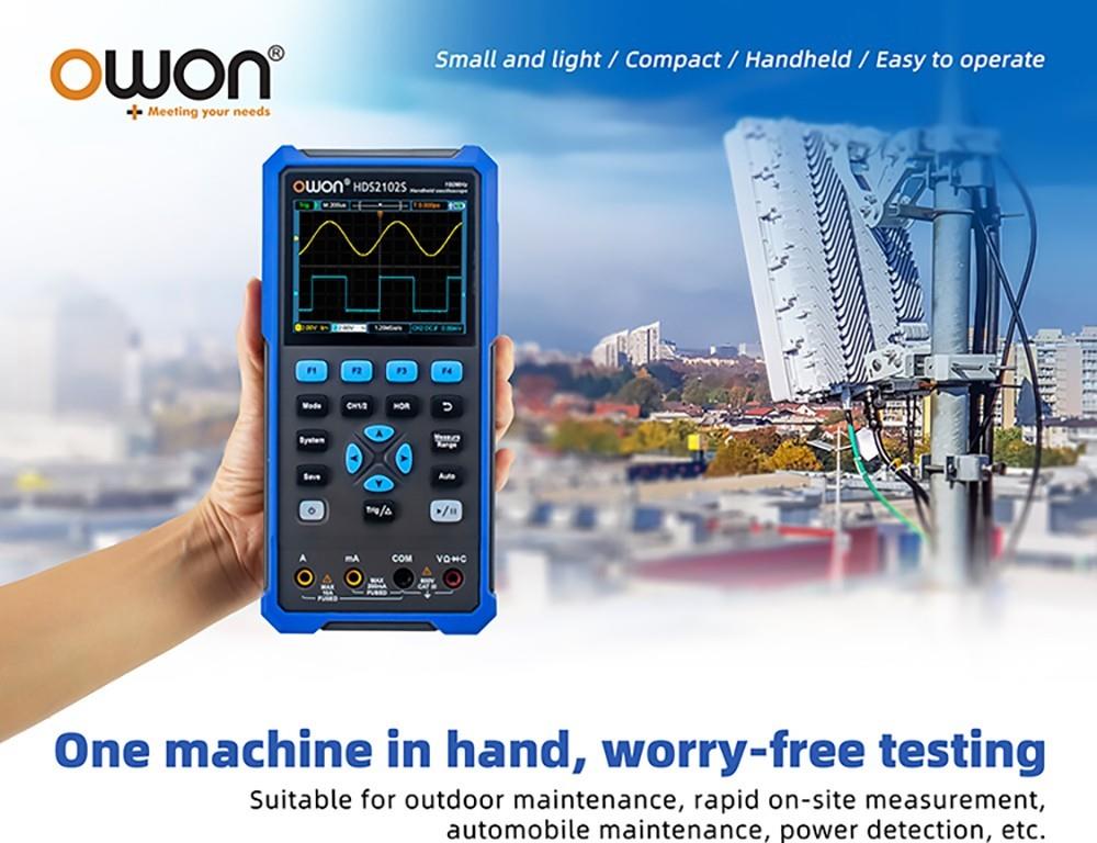 OWON HDS2102S is not only a digital oscilloscope but also a multimeter and a waveform generator. It is easy to operate and is suitable for outdoor maintenance, rapid on-site measurement, automobile maintenance, power detection, etc.