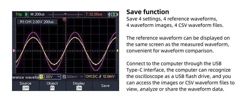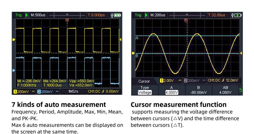 Features dual-channel input, 100MHz bandwidth, 500MSa/s real-time sampling rate, and max 8k record length. It also has a cursor measurement function and one key auto set function, easy to detect and debug.