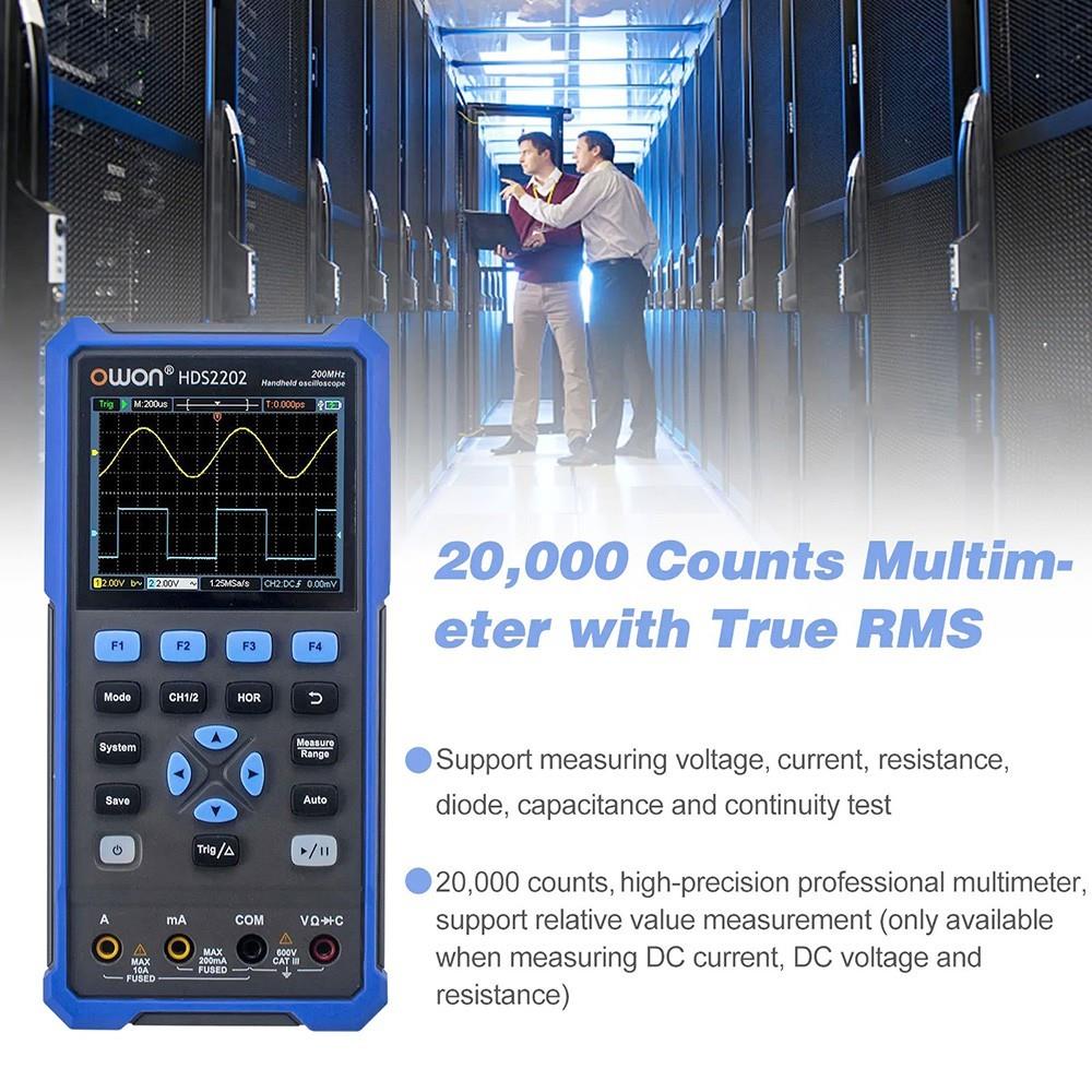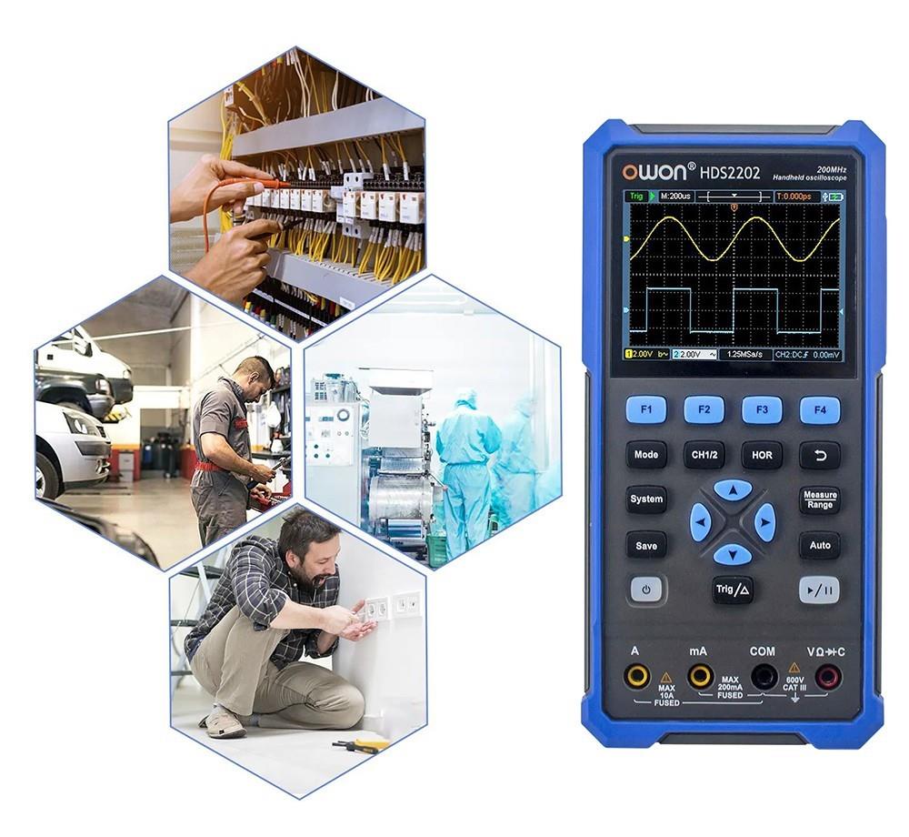 OWON HDS2202 features a digital oscilloscope function and a multimeter function at the same time. It is easy to operate and is suitable for outdoor maintenance, rapid on-site measurement, automobile maintenance, power detection, etc.