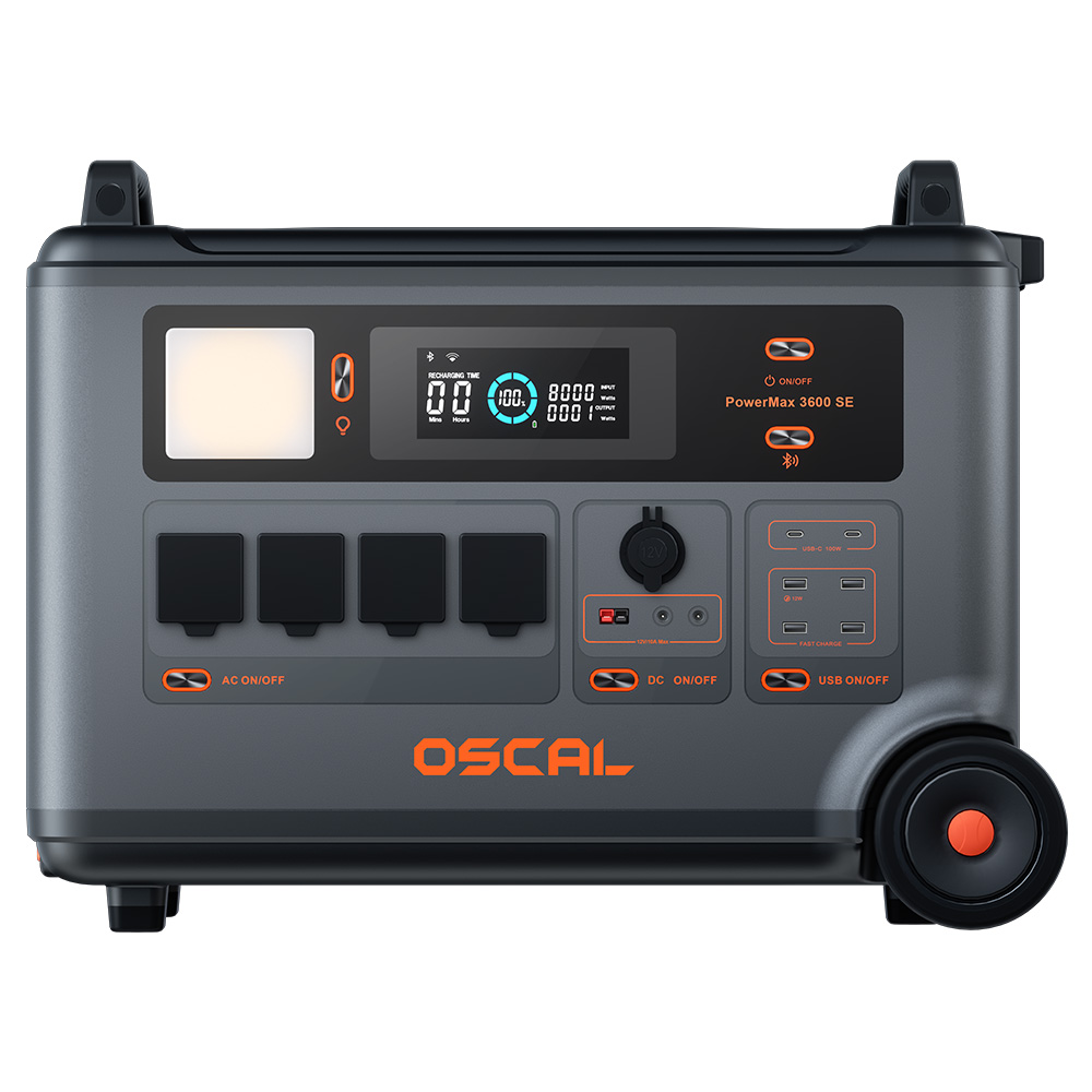 | Package Contents | 1 x Oscal PowerMax 3600 SE 1 x User Manual + Warranty Card 1 x AC Charging Cable 1 x Car Charging Cable 1 x Solar Charging Cable |